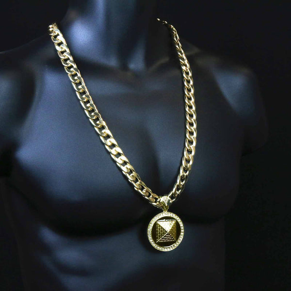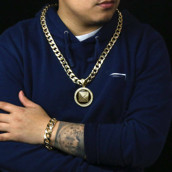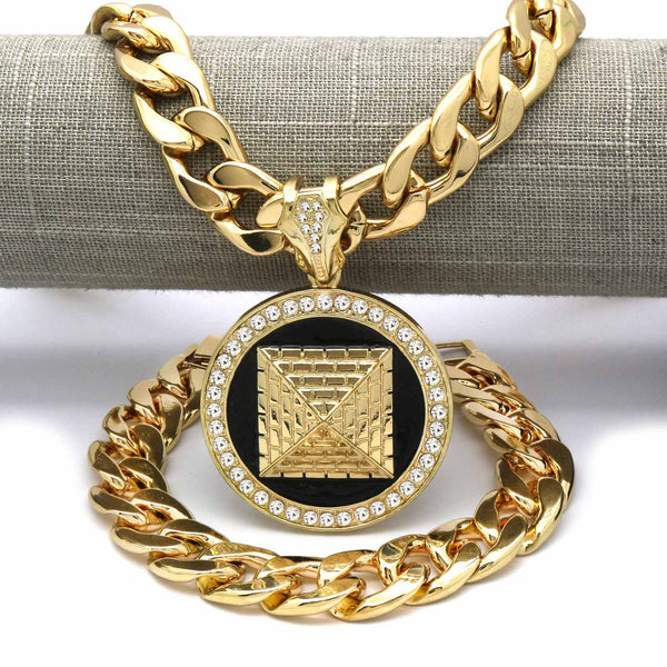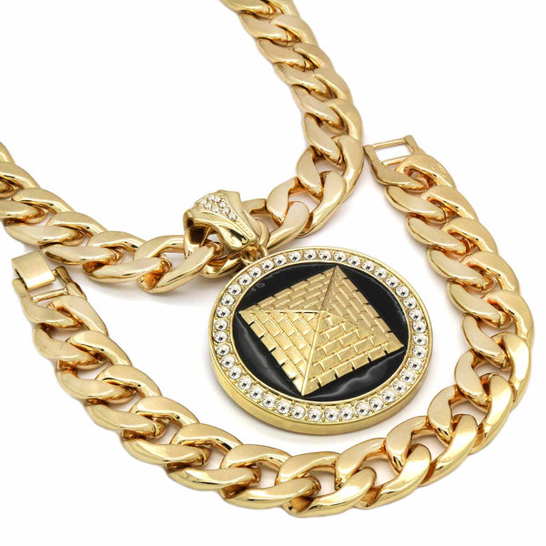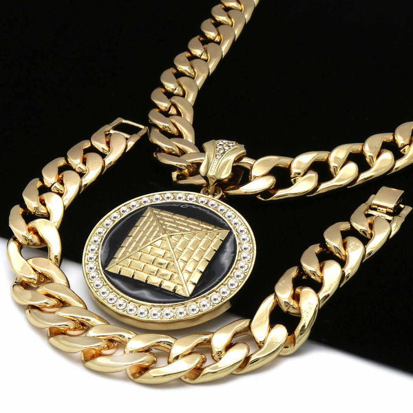 3 PCs Bundle Iced Out Gold/Black PYRAMID Pendant With Cuban Chain 14 mm 30" Cuban Chain + 14 mm 8" Cuban Bracelet Elegant Fully ICED OUT Cuban Chain Necklace Makes You...