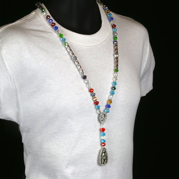 Multi Color Crystal Beads Rosary With Jesus middle part and Guadalupe Pendants Fashion Religious Jewelry Necklace that fit for all, Men, Women, Boy or Girl Each Bead of the Necklace is...