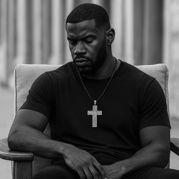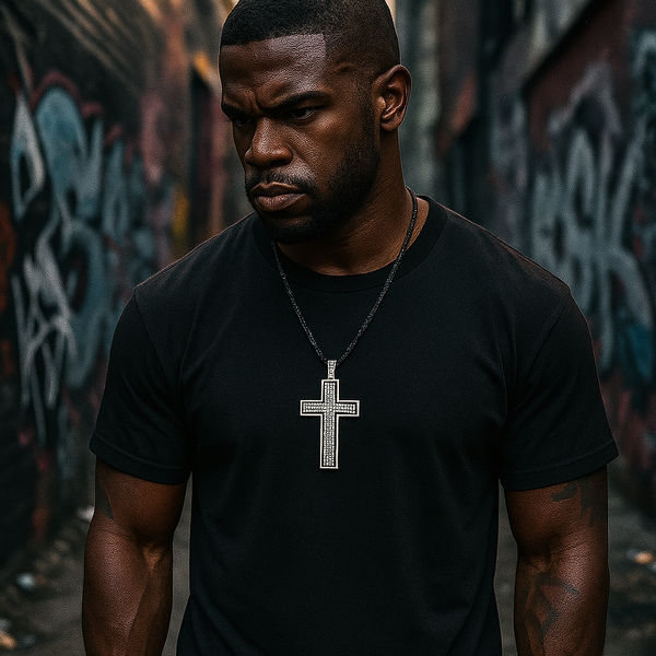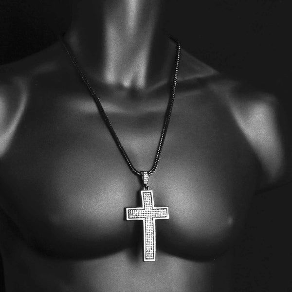 Make a bold statement with our Black/White Dome Cross Necklace, featuring a 4" x 2.5" iced-out black and white cross pendant. Surrounded by clear CZ stones, this pendant radiates sophistication...
