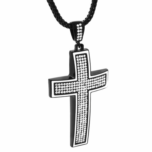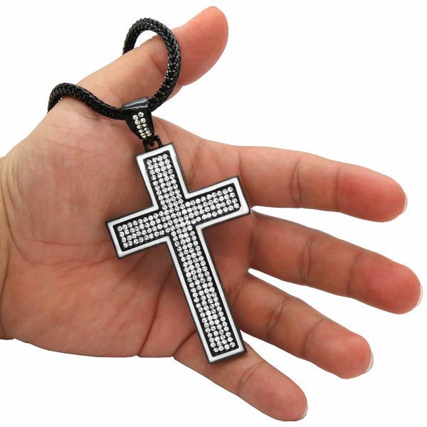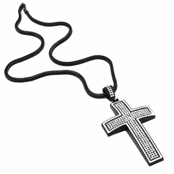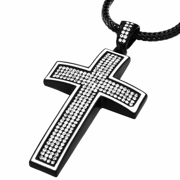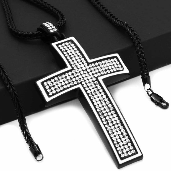 Black/White Dome Cross Necklace with Iced-Out CZ Stones & 30" Franco Chain – Black Hip Hop Pendant