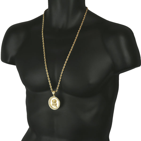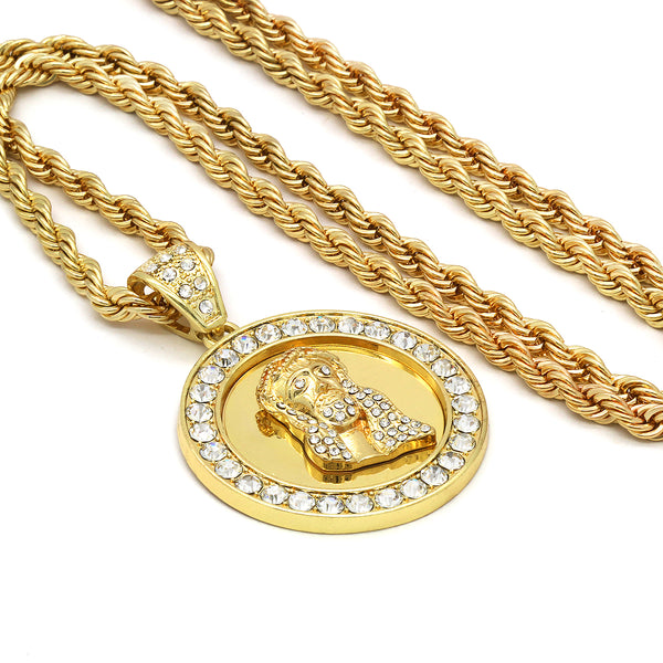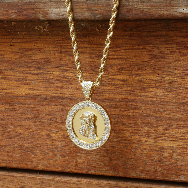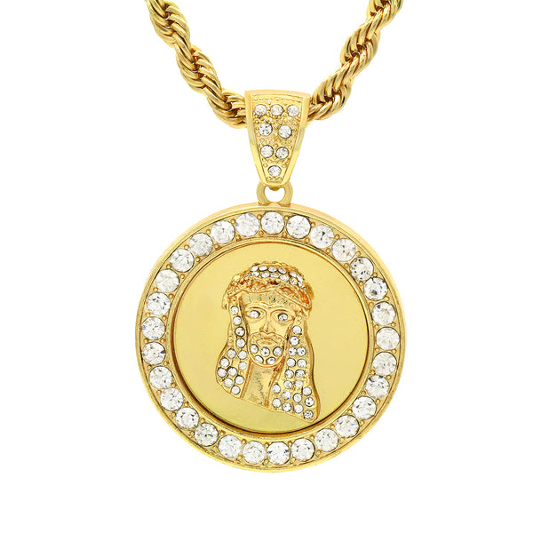 14k Gold Filled Fully Ice Out Round Mirror Jesus Pendant with Rope Chain
