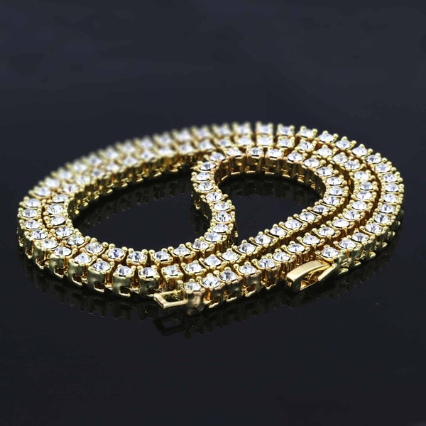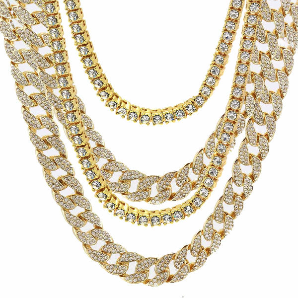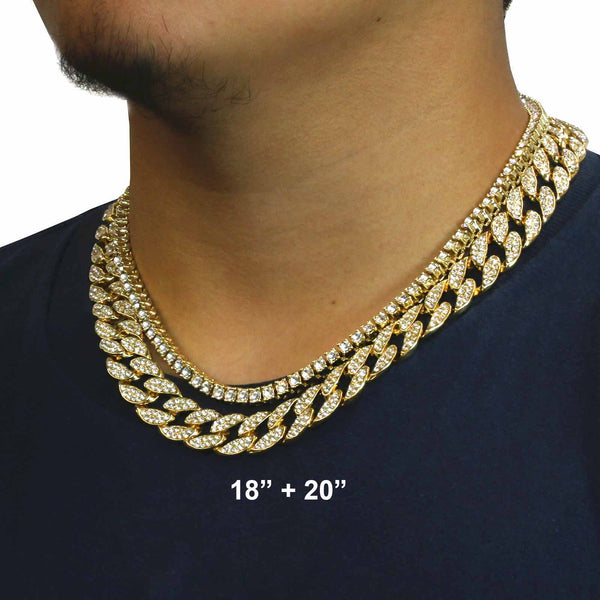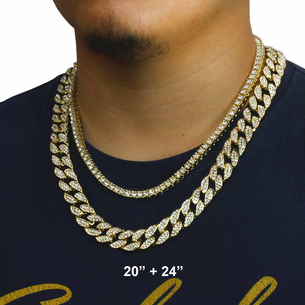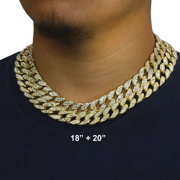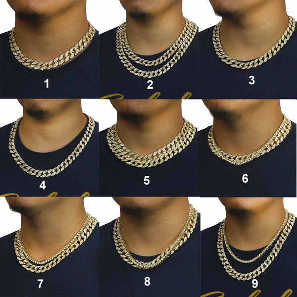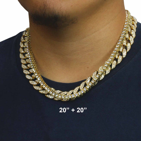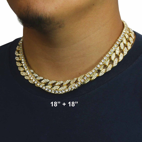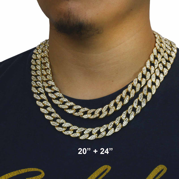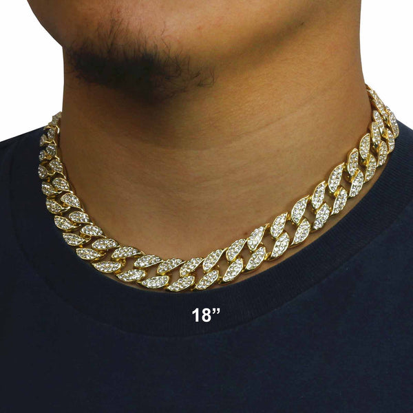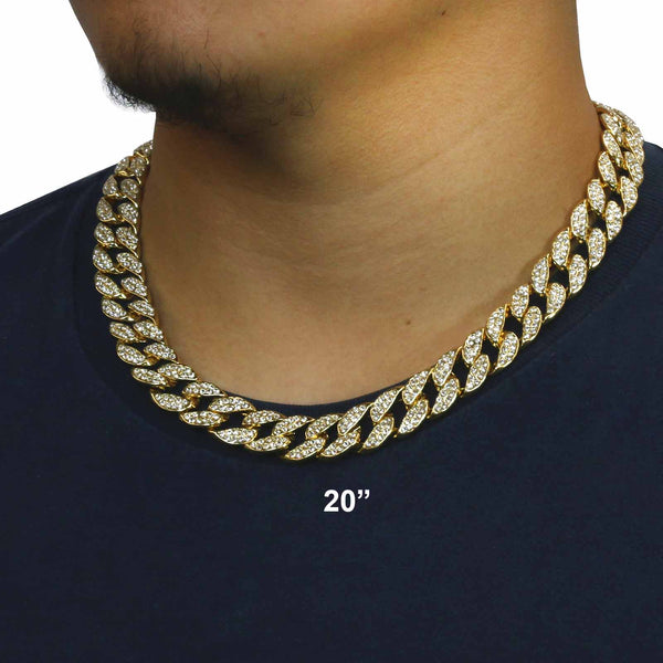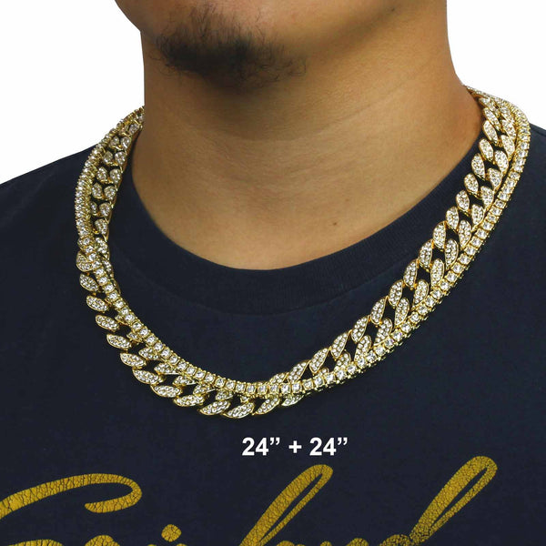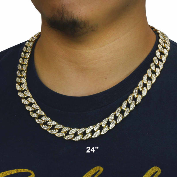 Elegant Cuban Real Gold Filled FULLY Iced Out Necklace.  Tarnishing Free "Life Time Guarantee" on Air Condition. High-impact 14k Gold Plating over Brass. Lustrous Cz Finish in front of every link....