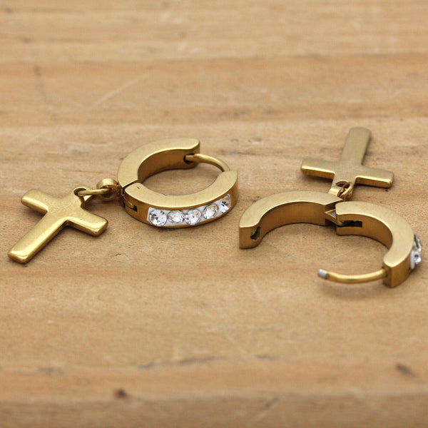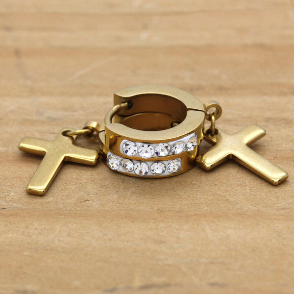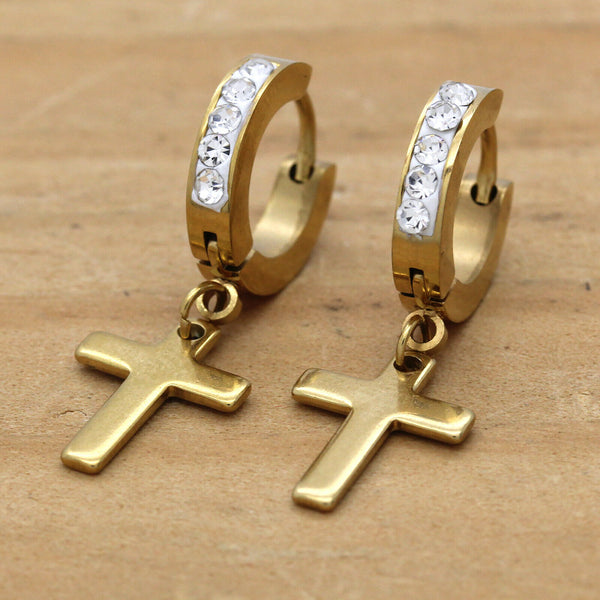 Cz Huggie Hoop Cross Dangle 1 Row GOLD STAINLESS STEEL FILLED EARRINGS