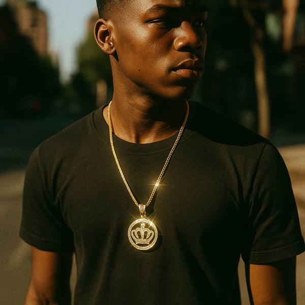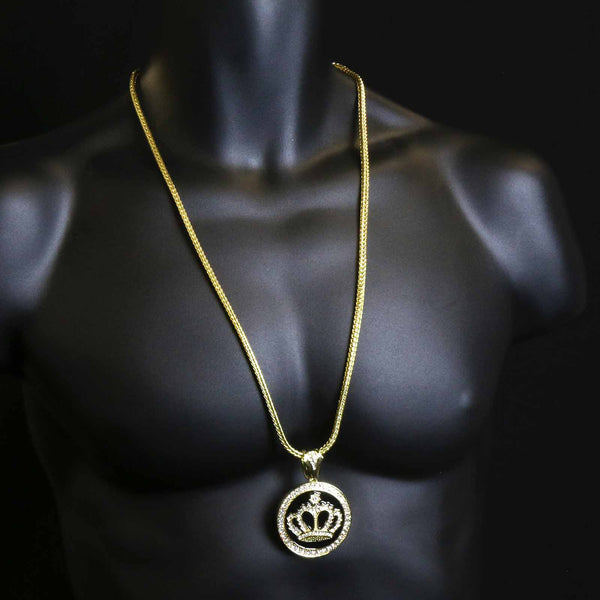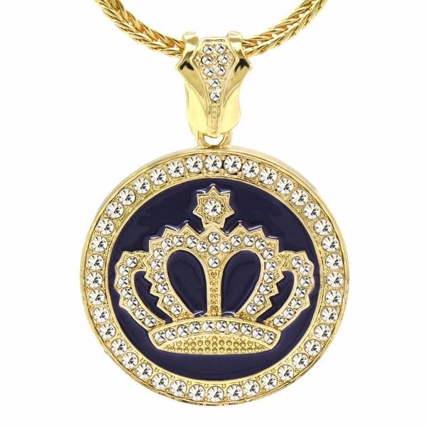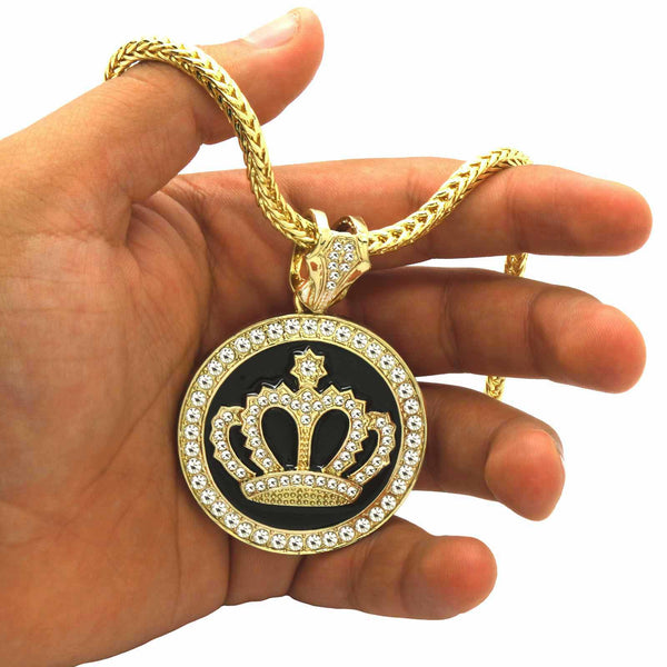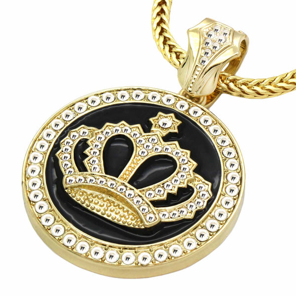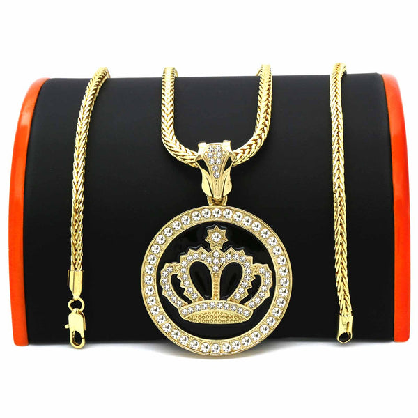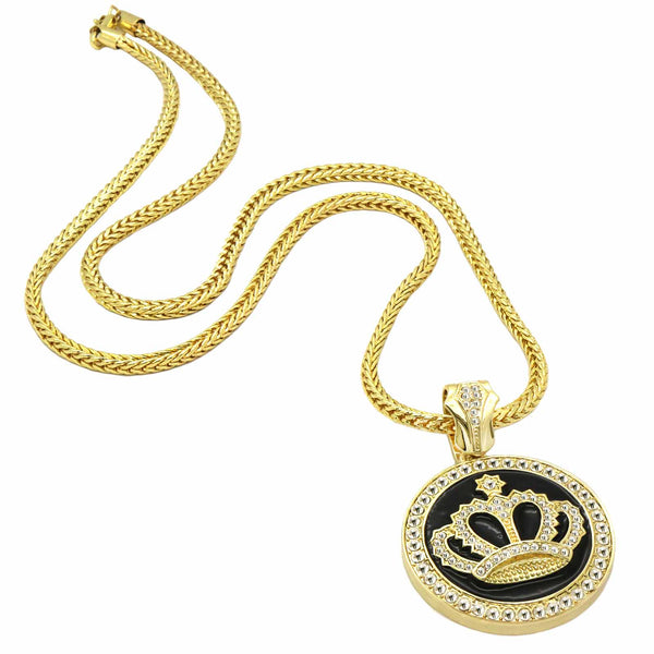 Gold Black Crown Necklace with Iced-Out CZ Stones & 30" Franco Chain – 14K Gold-Plated Hip Hop Pendant