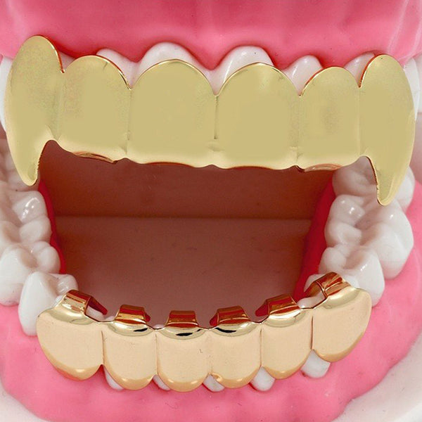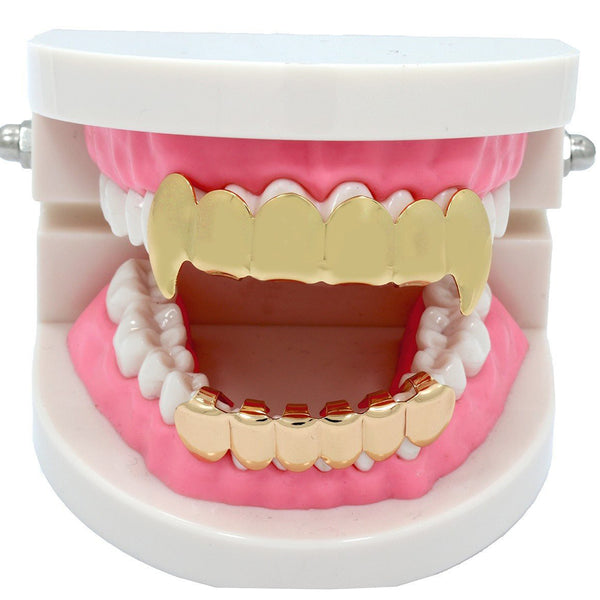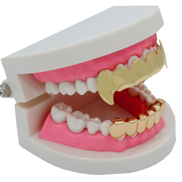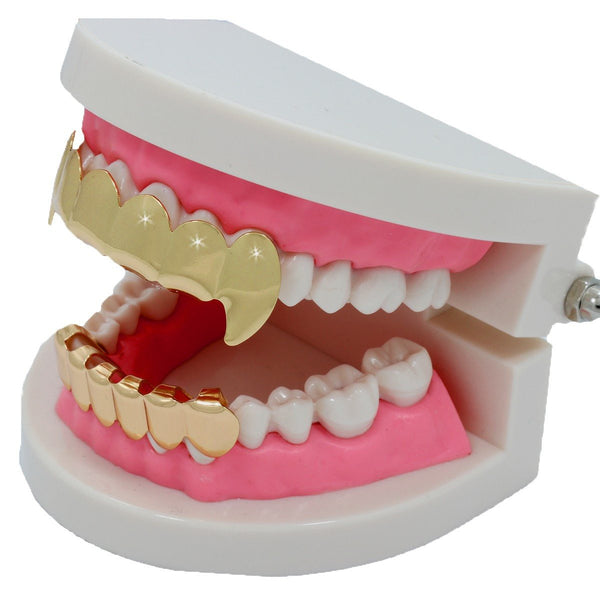 You will have Top& Bottom Grillz as a set, The Grillz is Plain Simple Gold Look but Still one of the Most Popular design,The Fang will be strong point look as Dracula....