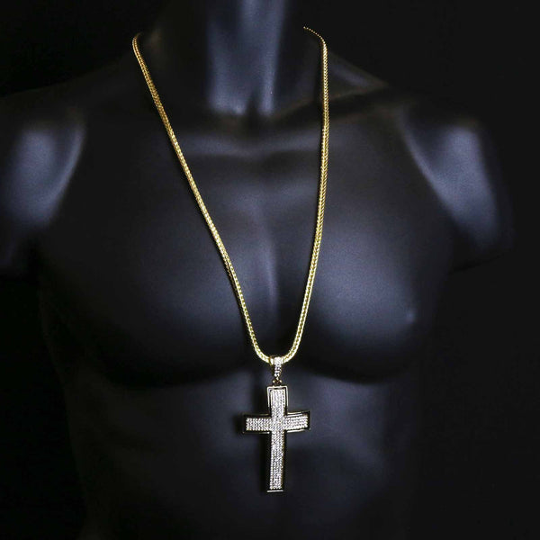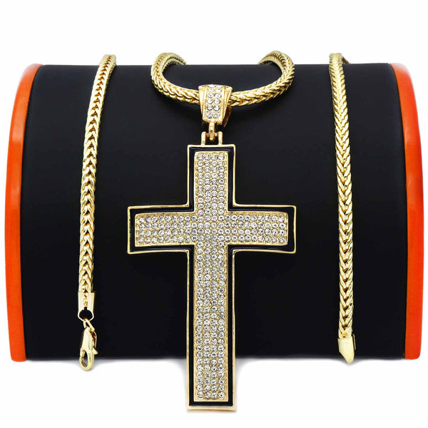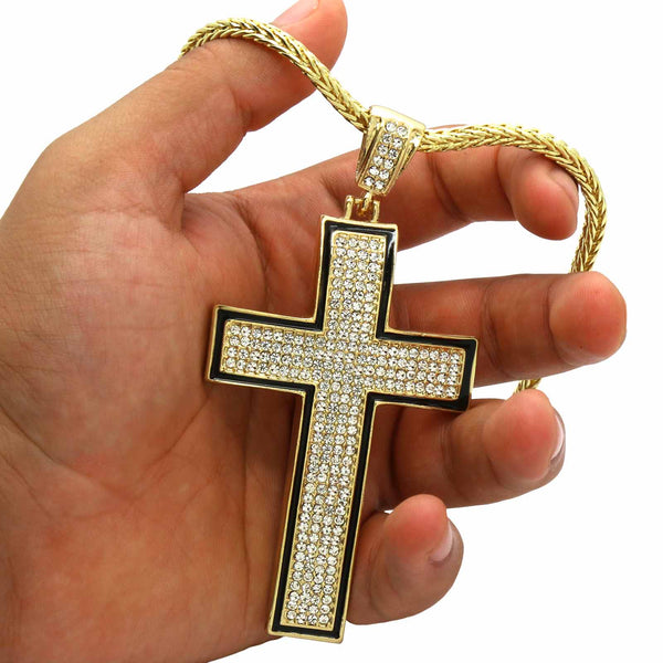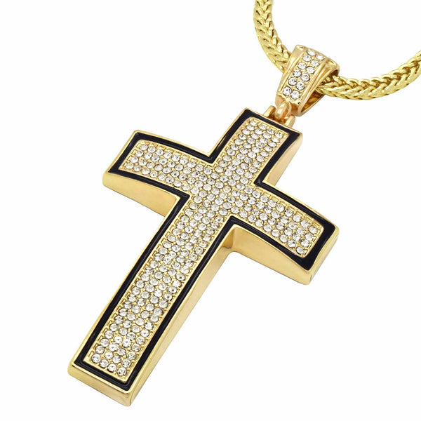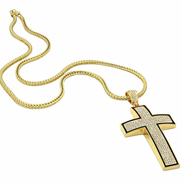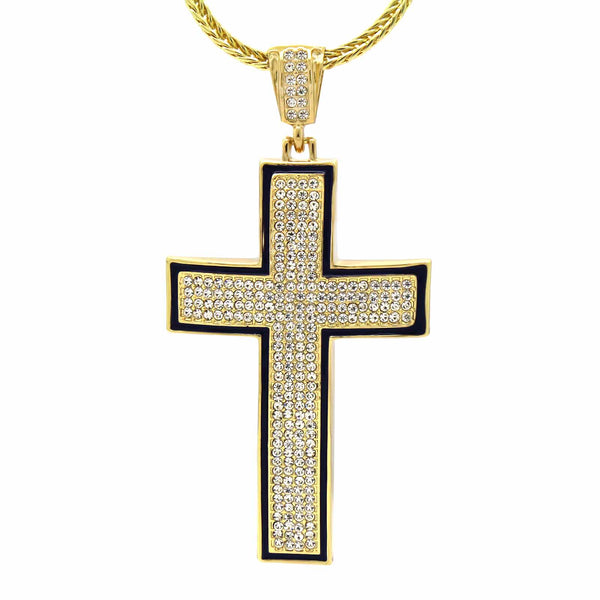 Gold Black Cross Necklace with Iced-Out CZ Stones & 30" Franco Chain – 14K Gold-Plated Hip Hop Pendant