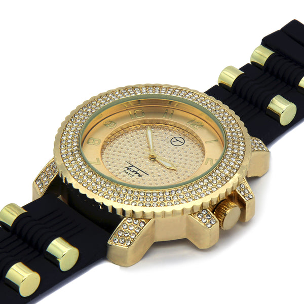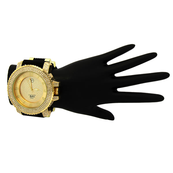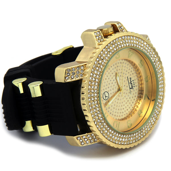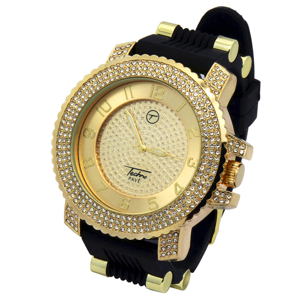 Techno Pave Bling Fully Iced Silicone Band Wrist Watch Big Size Face Diameter: 53mm Thickness: 15mm Stylish and trendy with scratch resistant mineral glass Bling Iced out bezel filled with lavish genuine Czech...