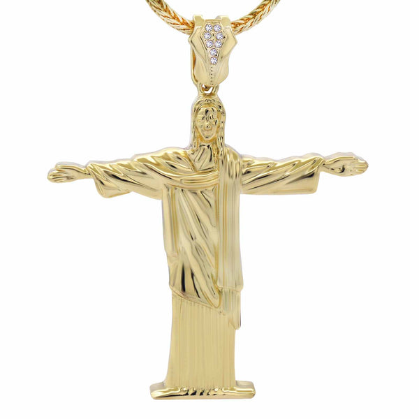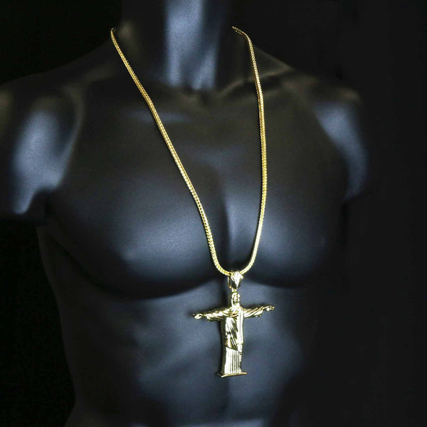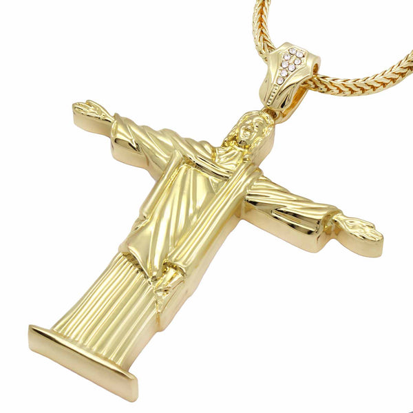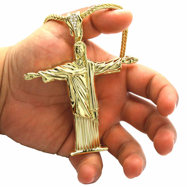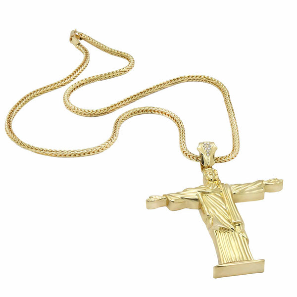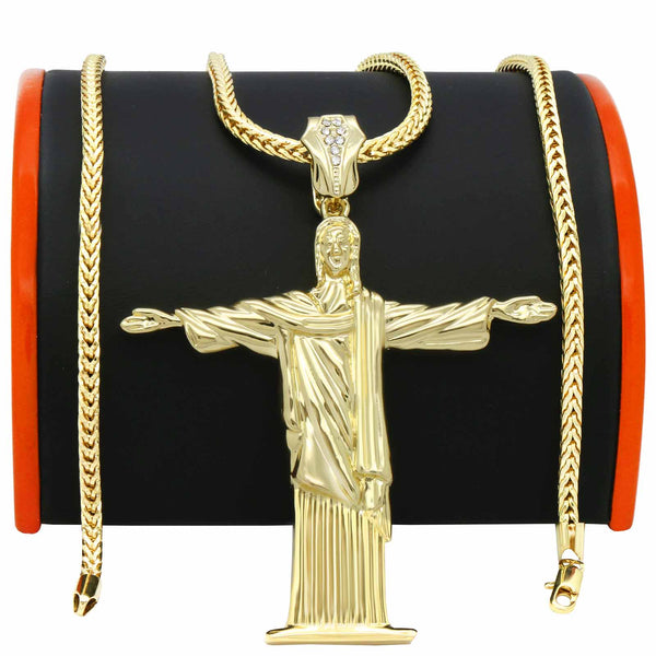 Color:Gold plain Size: Pendant:4" x 3" / Chain:4 mm 30"  Iced Out Gold Jesus Pendant With 4 mm 30" Franco Chain  Hip Hop Bling 14K Gold Filled Necklace Pendant Gold...