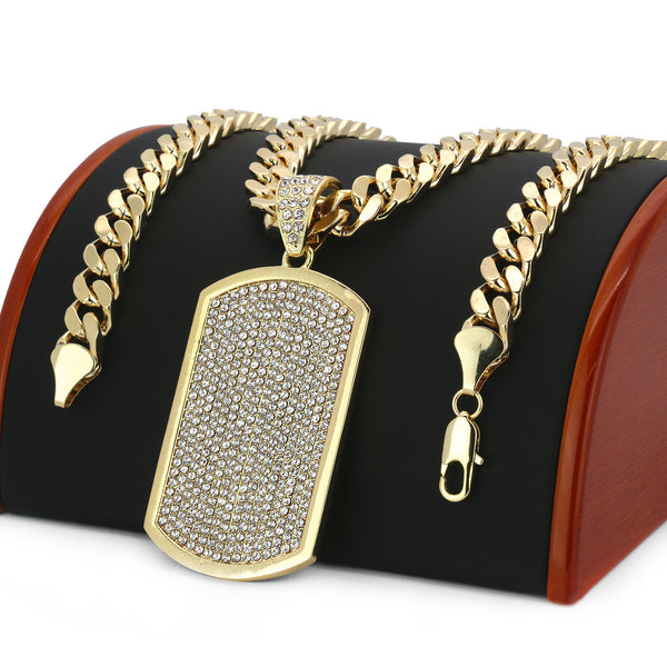 Color:Gold Size: Pendant:21/2" x 2" / Chain:10 mm 30"  Iced Out Gold Dog Tag Pendant With 10 mm 30" Cuban Chain  Hip Hop Bling 14K Gold Filled Necklace Pendant Gold Over...