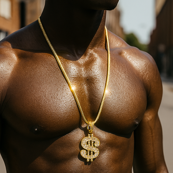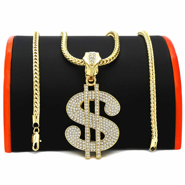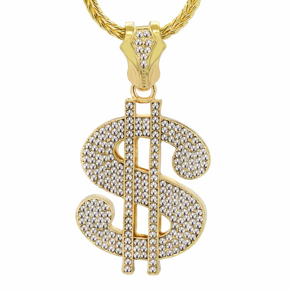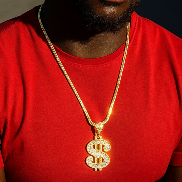 Indulge in the epitome of luxury with our Gold Dollar Necklace, featuring a 3.5" x 1.5" iced-out dollar pendant surrounded by clear CZ stones. Crafted with 14K gold plating and...