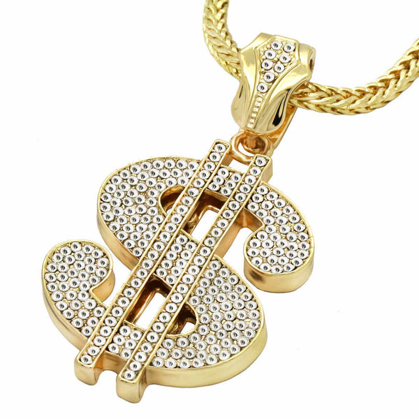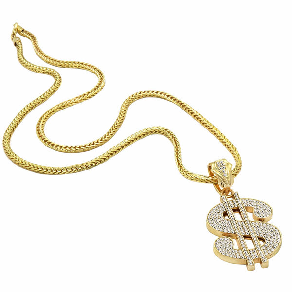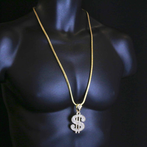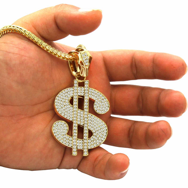 Gold Dollar Necklace with Iced-Out CZ Stones & 30" Franco Chain – 14K Gold-Plated Hip Hop Pendant