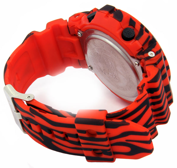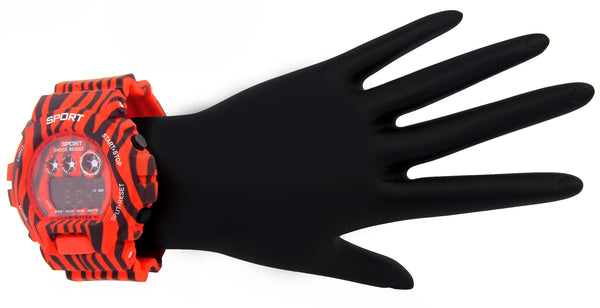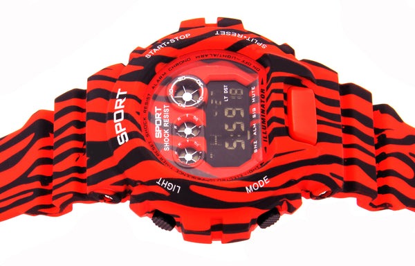 Red Shock Resistant LCD Wrist Watch Bright Red Color Case with Silicone band Face Diameter: 48mm Thickness:12mm G-Shock Style Looking Design Stylish and trendy with scratch resistant mineral glass High Quality Japanese fine-tuned...