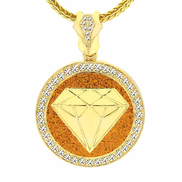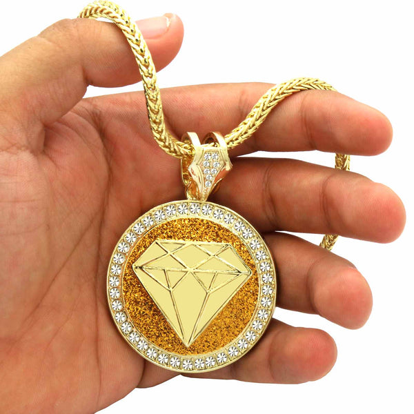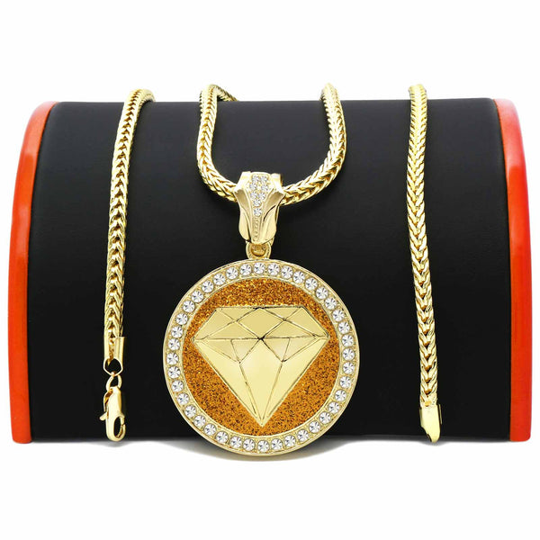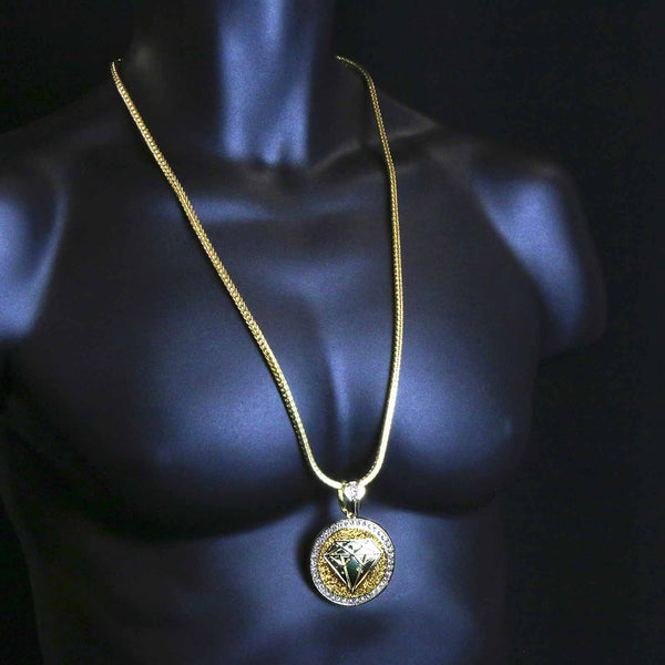 Gold Diamond Necklace with Iced-Out CZ Stones & 30" Franco Chain – 14K Gold-Plated Hip Hop Pendant