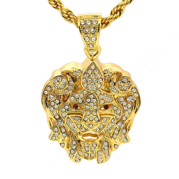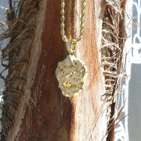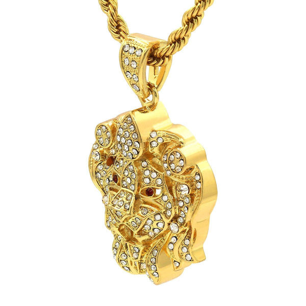 Elegant 14k Gold Plated Lion Head Pendant Necklace.  High-impact Sparkling Diamond With 14k Lavish Gold Finish over Brass. Lustrous Silky Finish in front of all links. Diamond Lab CZ Iced Out...