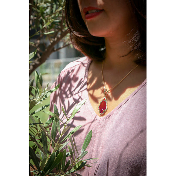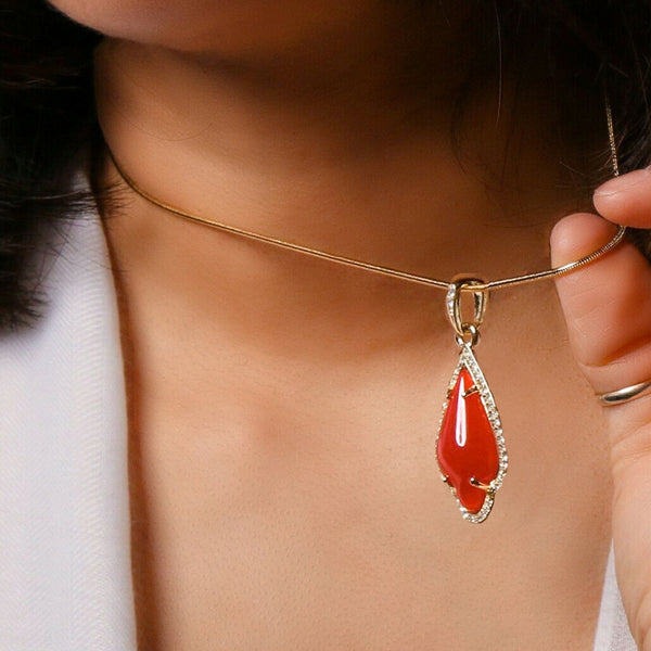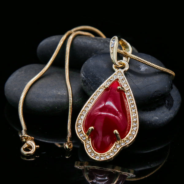 Red Women's Pendants 14K Gold Plated Lab Diamond Mounted Curved Tear Resin Jade High Fashion Jewelry Chain Pendant Necklaces