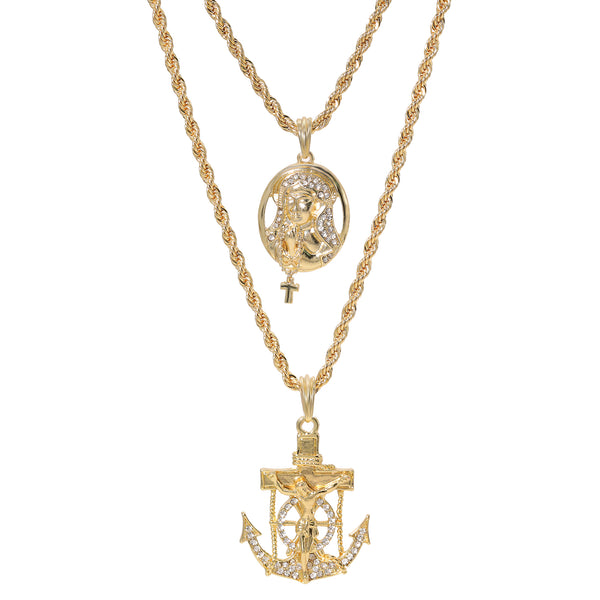 Jesus Anchor & Round Cross Mary Pendant Gold Plated 24, 30 Rope Chain Cubic-Zirconia