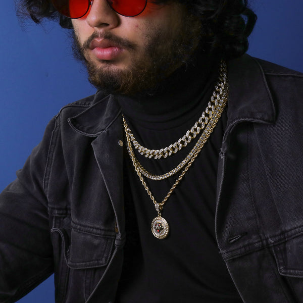 Chain Size: 4mm/24" Pendant Size: Weight: 34.6 Grams Measurements: 4.3 Cm x2.7 Cm This Pendant hanging from a 4mm 24" rope chain . Each and every stone on this pendant is prong set,...