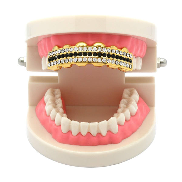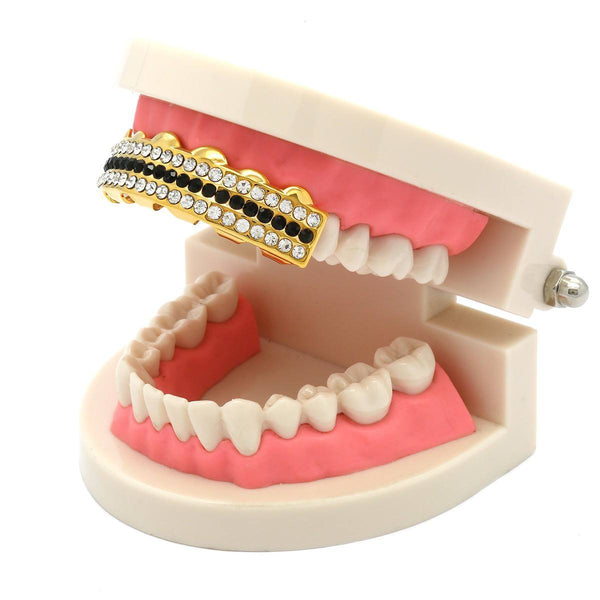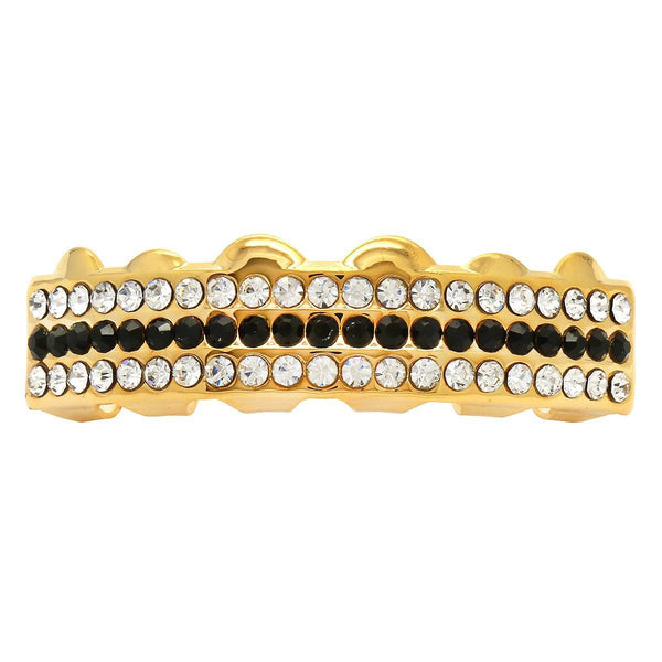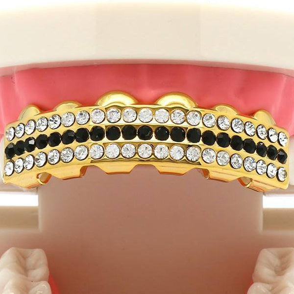 This listing is for these Gold Plated 3 row Iced out grillz. Its 3 Rows of stones with the black accent stones in the center gives it a unique look...