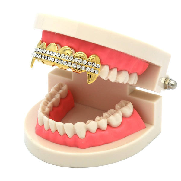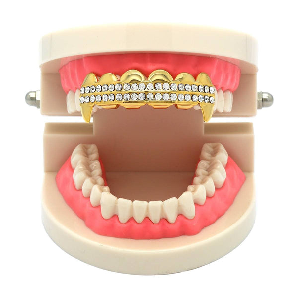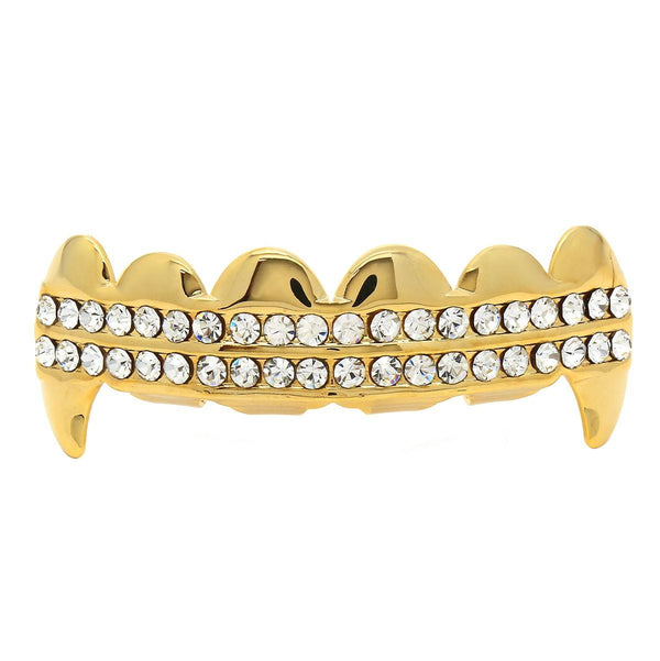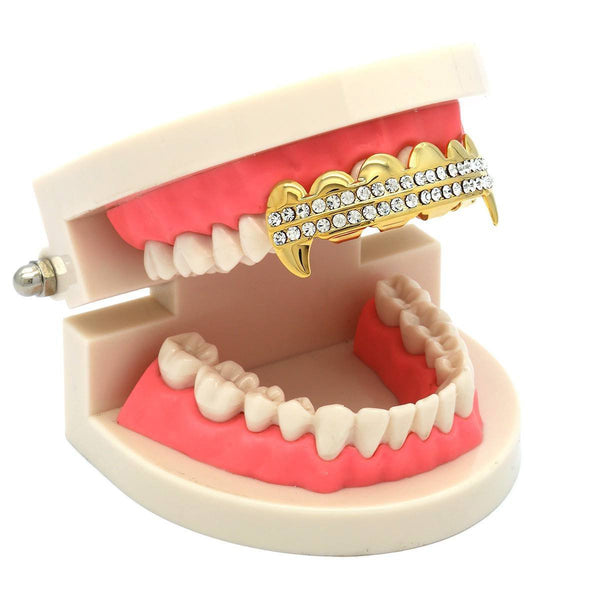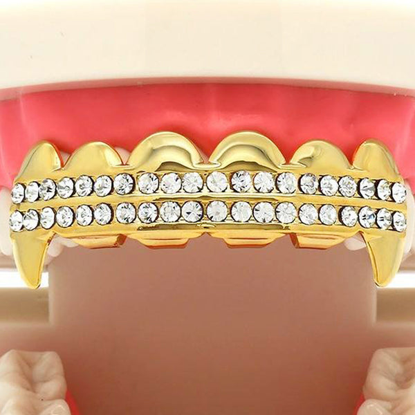 These Gold Plated Top  Fang Grillz are laid out with 2 rows of hand set stones.The fangs on the these grillz are perfect if attention is what you're seeking BEST GRILLZ™  Gold...