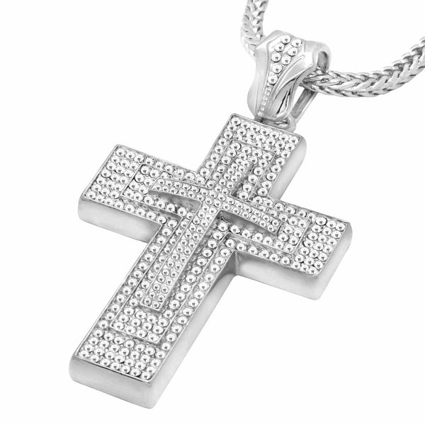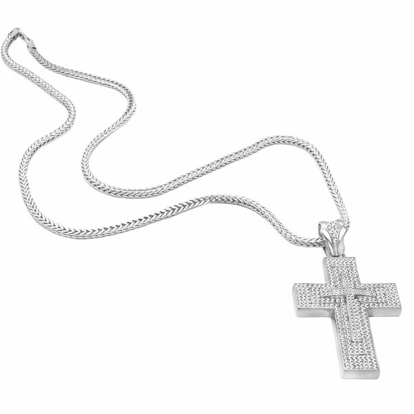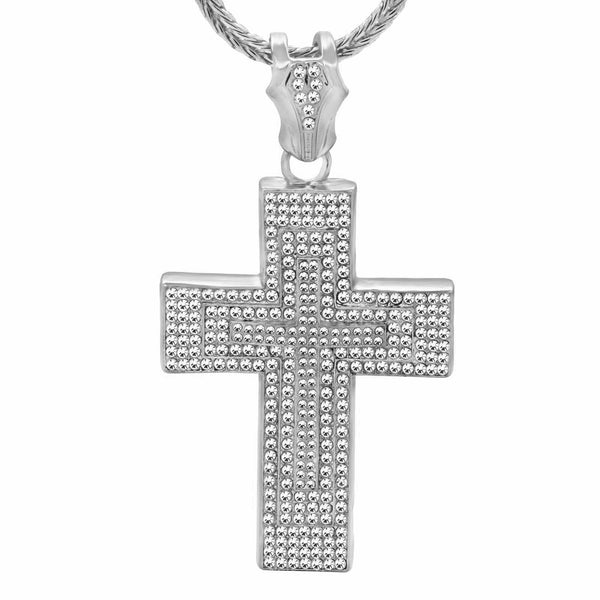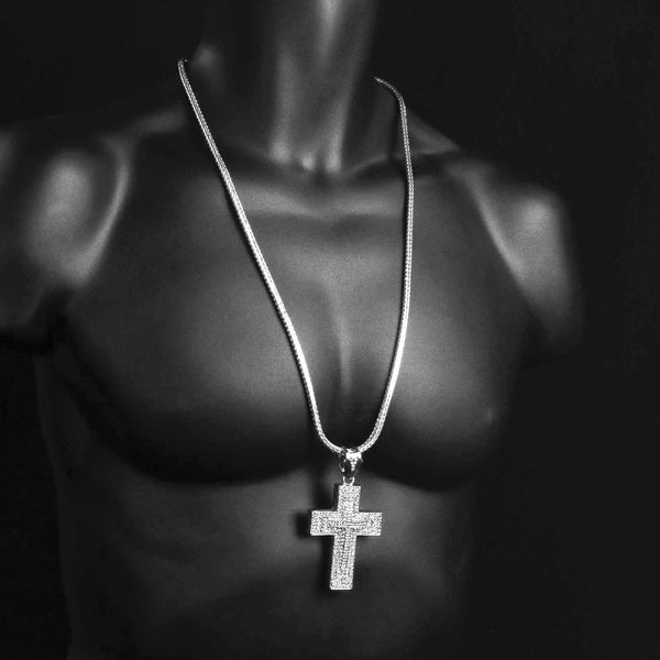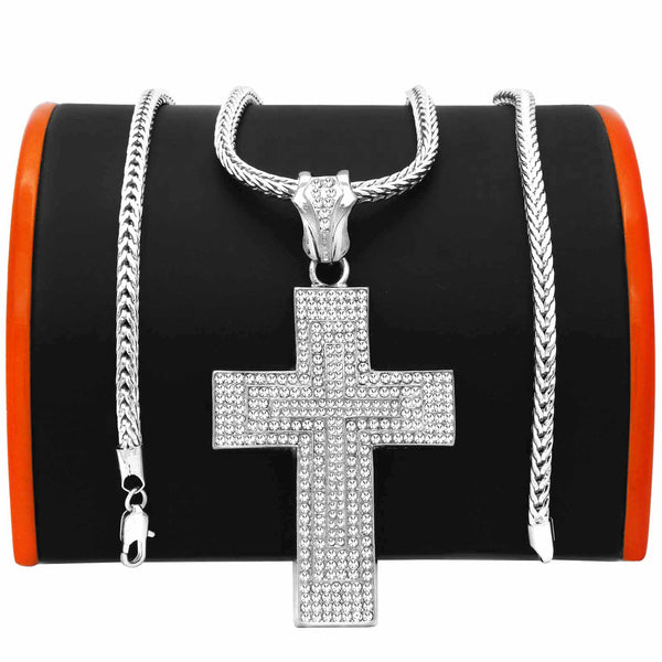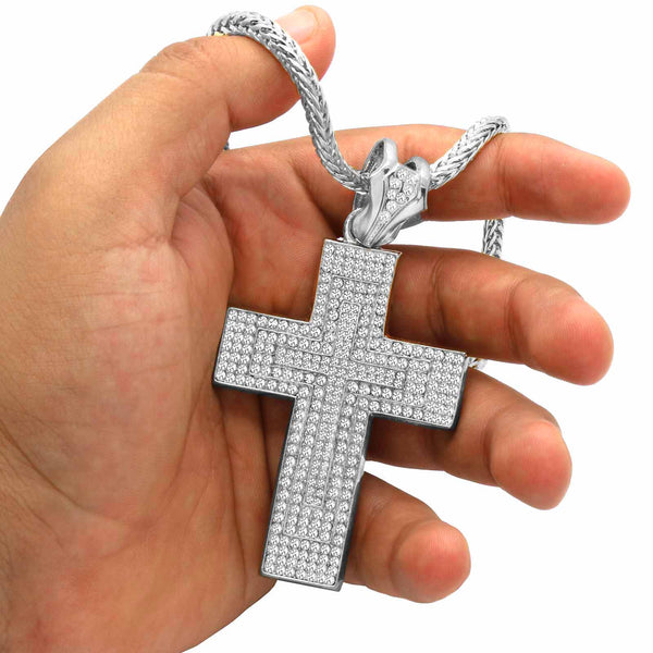 Color:Silver  Size: Pendant:31/2" x 21/2" / Chain:10 mm 36"  Iced Out Silver Double Edge Cross Pendant With 4 mm 30" Franco Chain  Hip Hop Bling 14K White Gold Filled Necklace...