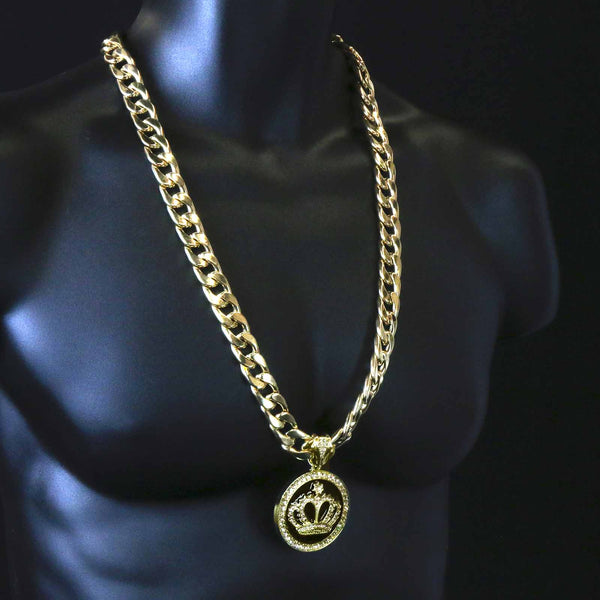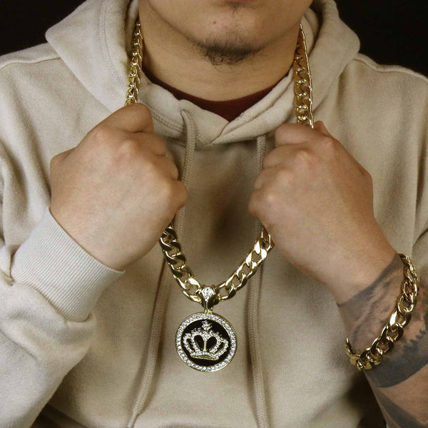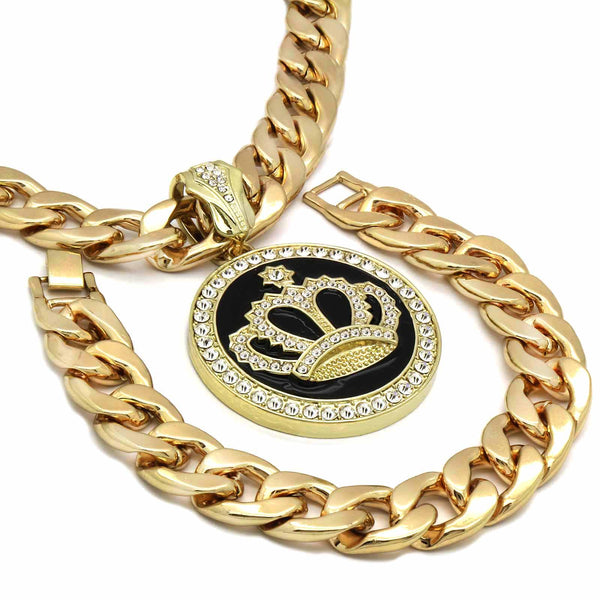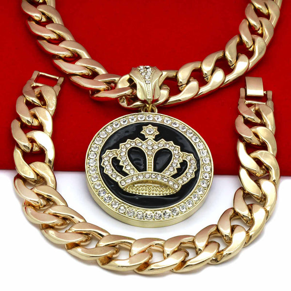 3 PCs Bundle Iced Out Gold/Black Crown Pendant With Cuban Chain 14 mm 30" Cuban Chain + 14 mm 8" Cuban Bracelet Elegant Fully ICED OUT Cuban Chain Necklace Makes You Shine...