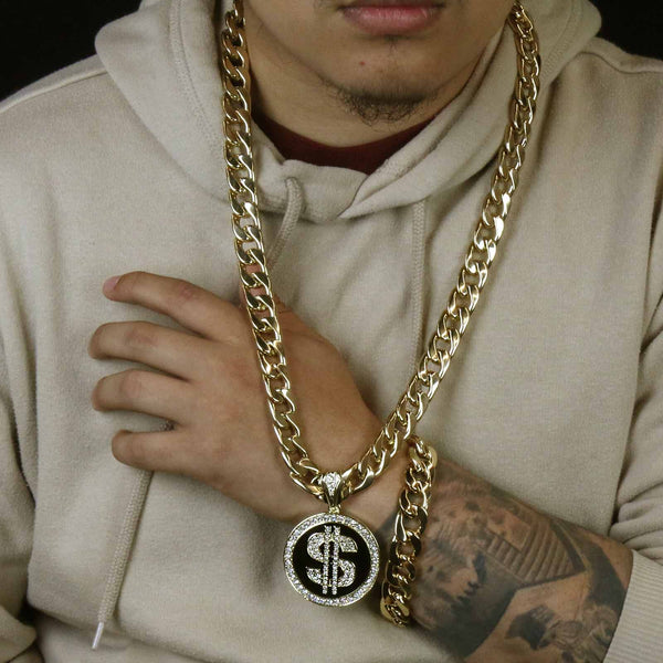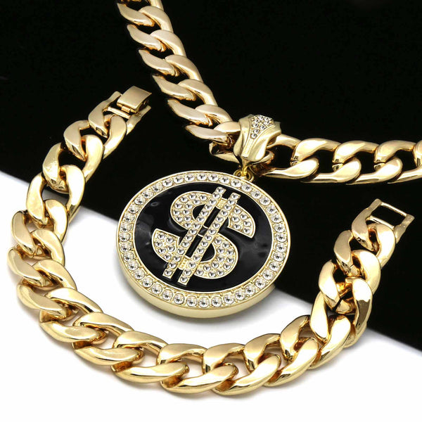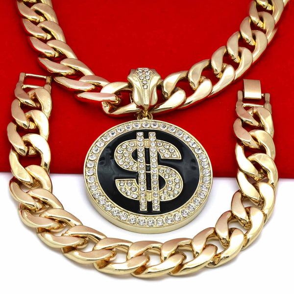CUBAN CHAIN & BRACELET GOLD/BLACK DOLLAR SIGN