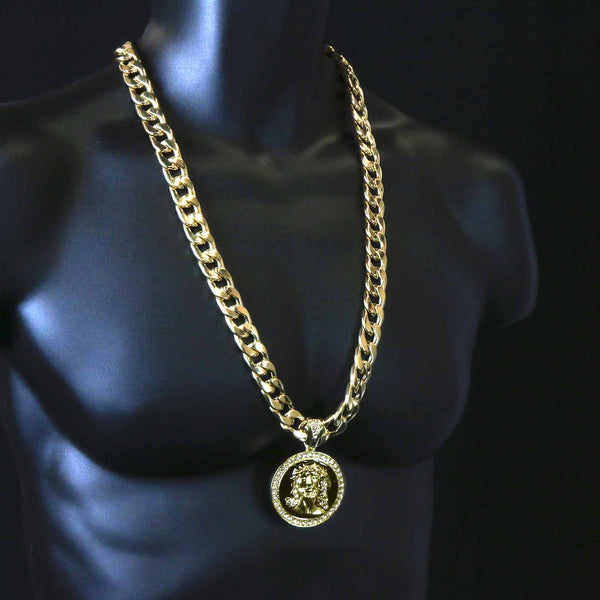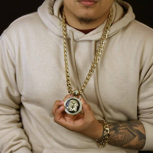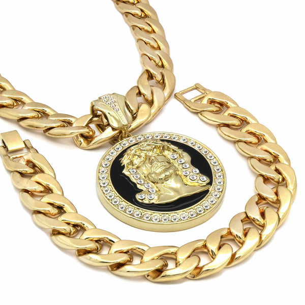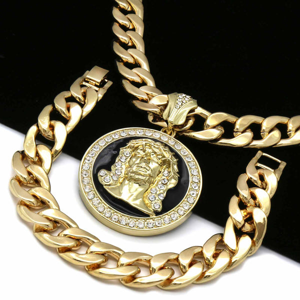 3 PCs Bundle Iced Out Gold/Black Jesus Pendant With Cuban Chain 14 mm 30" Cuban Chain + 14 mm 8" Cuban Bracelet Elegant Fully ICED OUT Cuban Chain Necklace Makes You Shine...