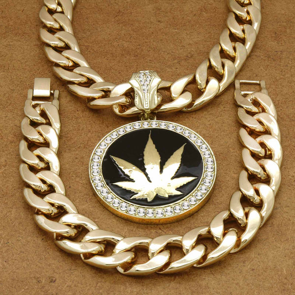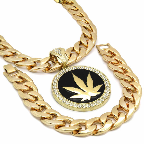 CUBAN CHAIN & BRACELET GOLD/BLACK MARIJUANA LEAF