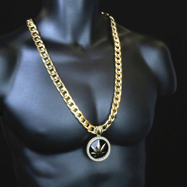 3 PCs Bundle Iced Out Gold/Black Marijuana Leaf Pendant  14 mm 30" Cuban Chain + 14 mm 8" Cuban Bracelet Elegant Fully ICED OUT Cuban Chain Necklace Makes You Shine Perfect. High-impact...