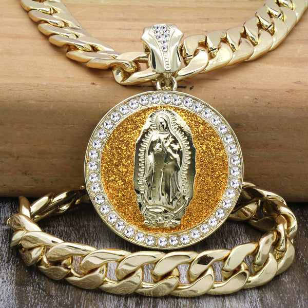 3 PCs Bundle Iced Out Chain Pendant Gold GUADALUPE Pendant With Cuban Chain 14 mm 30" Cuban Chain + 14 mm 8" Cuban Bracelet Elegant Cuban Chain Makes You Shine Perfect. High-impact...