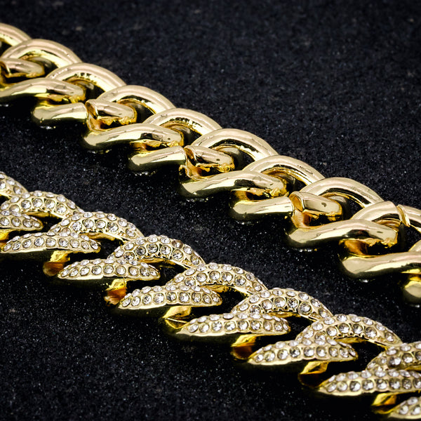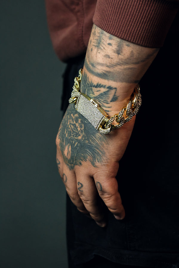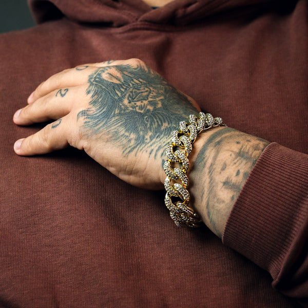 Elegant Fully ICED OUT Bracelet Makes You Shine Perfect. High-impact 14k Gold Plating over Brass Large width of 17 mm / 9" Inches medium sized Bracelet Carefully interlocked links that create a...