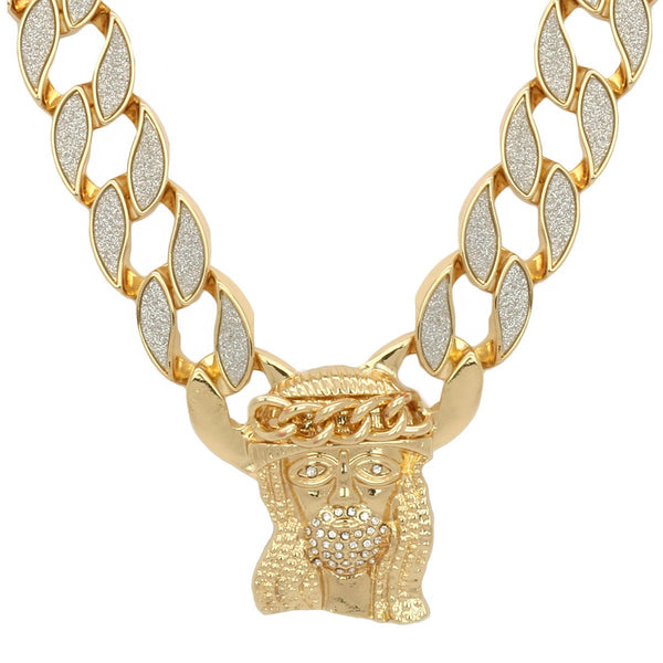 Elegant Cuban Gold Plated Jesus Head Sandblast Necklace.  High-impact 14k Gold Plating over Brass. Lustrous Stardust Finish in front of all links. Diamond Lab CZ Iced Out Jesus Pendant Carefully interlocked...