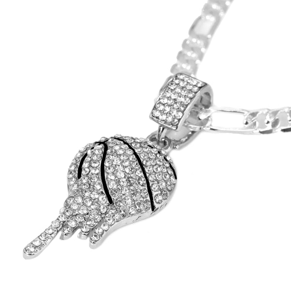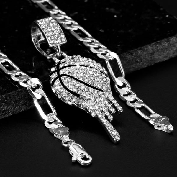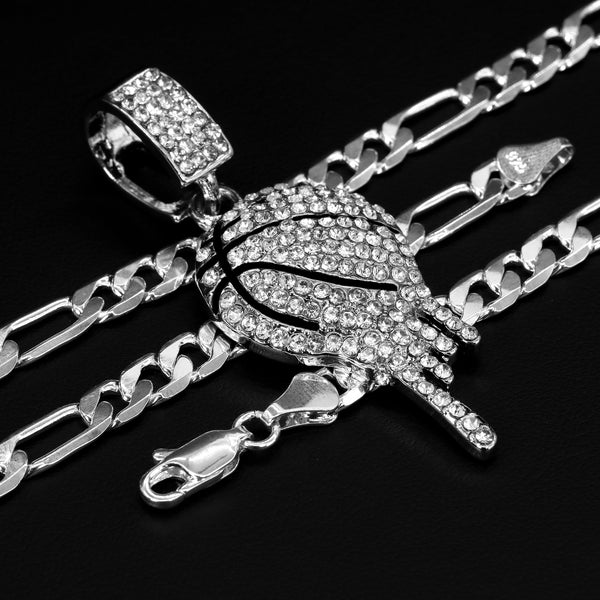 Cubic-Zirconia Drip Basketball Pendant Silver Plated 925 Figaro Choker 20" Chain