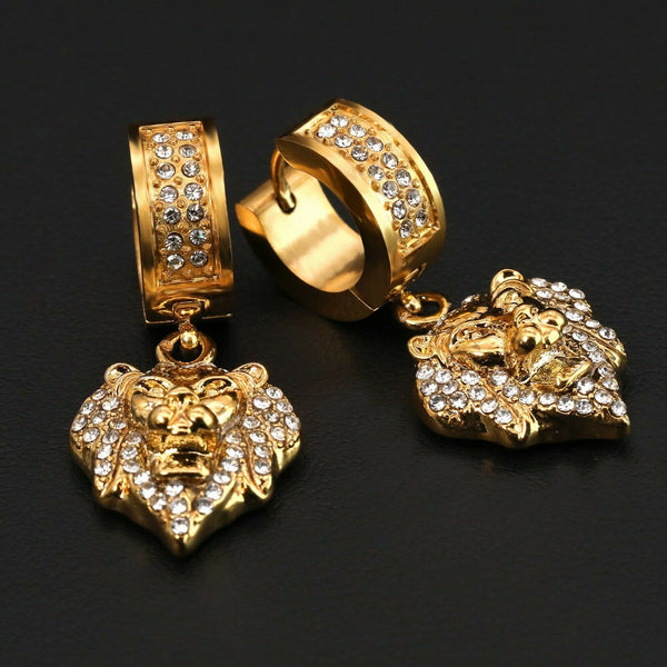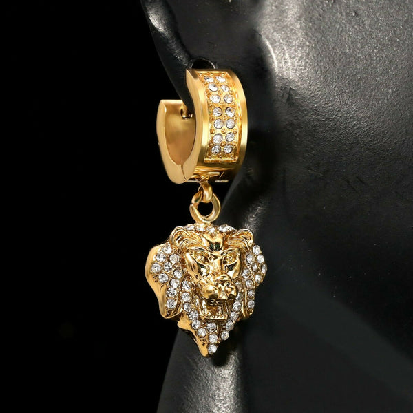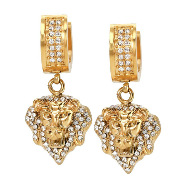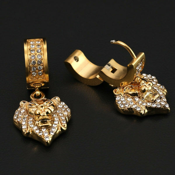 Cubic-Zirconia Gold Stainless Steal 2 Row Lion Head Huggie Hoop Dangle Earrings