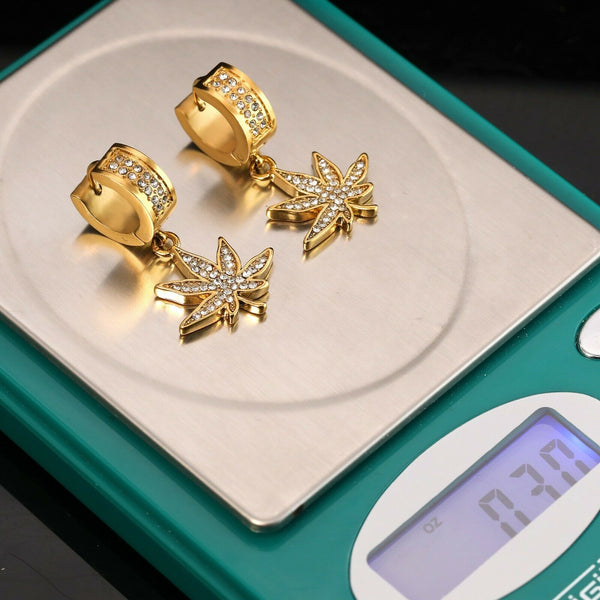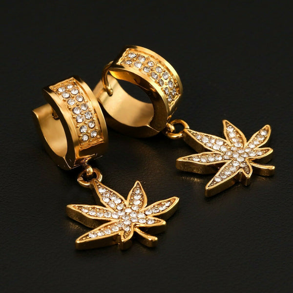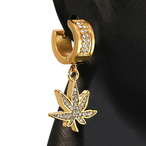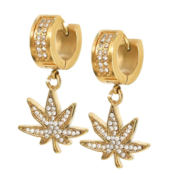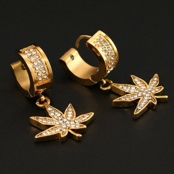 Cubic-Zirconia Gold Stainless Steal 2 Row Marijuana Huggie Hoop Dangle Earrings