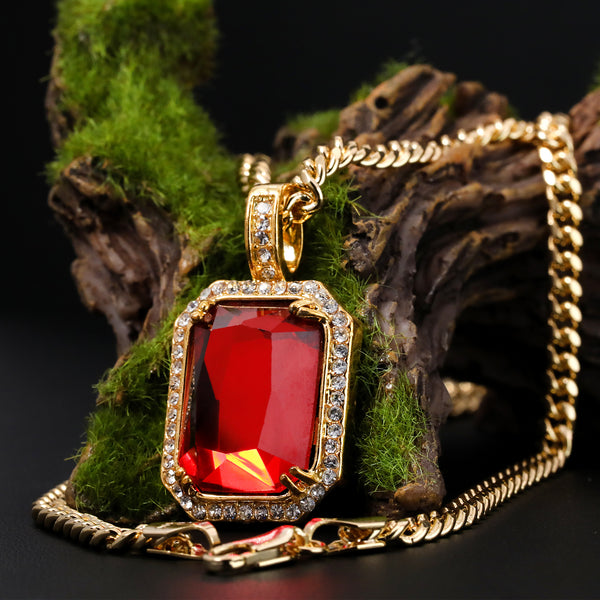 Cubic-Zirconia Mini Red Stone Pendant 3mm 24" Cuban Chain Gold Plated Necklace