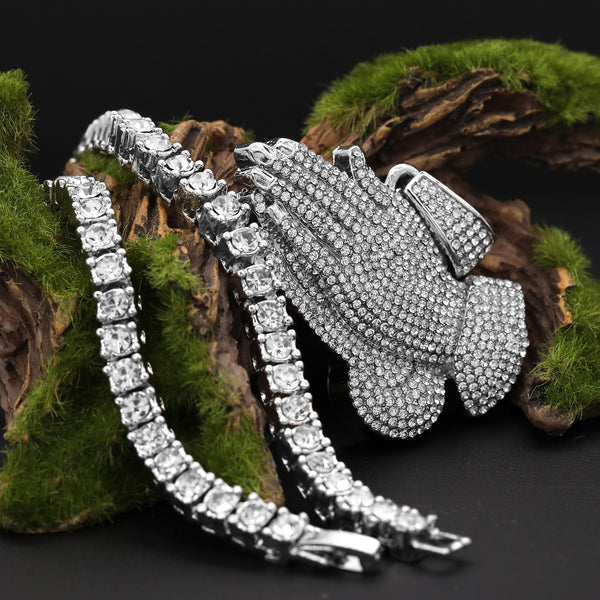 These are hot 1 Pcs of 18"tennis chains with trendy Prayer Hands Pendant which made with incredible details and craftsmanship. 3 wearing way:1. CZ tennis chain + pendants; 2. CZ...
