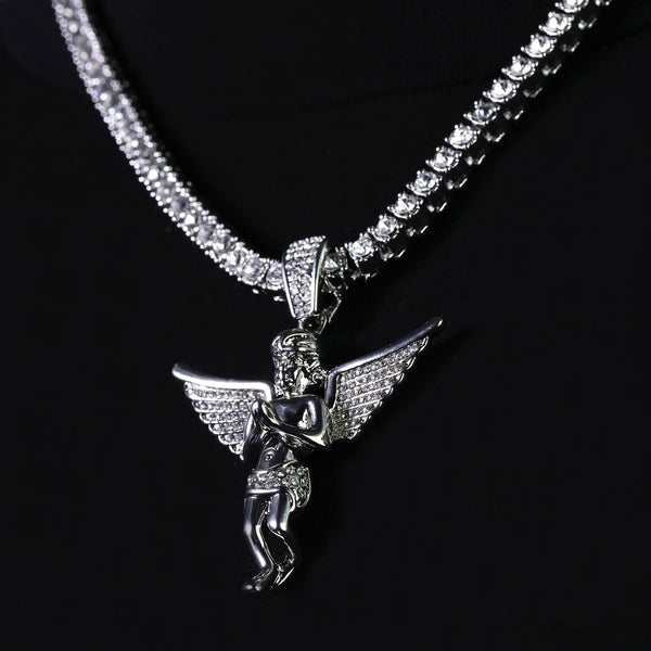 Cubic-Zirconia Thick Wing Angel Pendant Silver Plated Tennis 18" Chain Choker