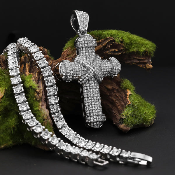Cubic-Zirconia Thick X Cross Pendant Silver Plated Tennis 18" Chain Choker