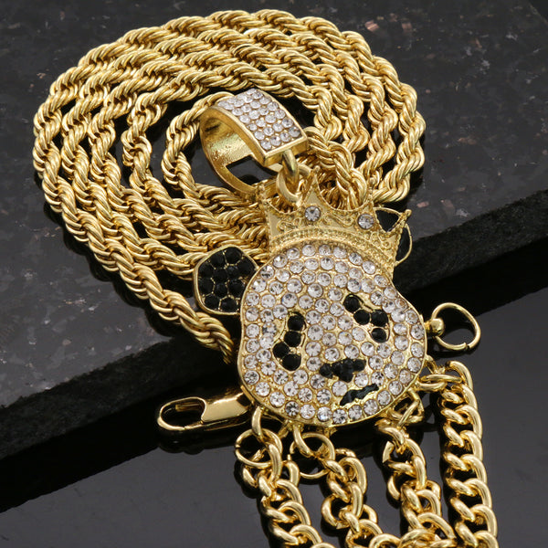 Cz Panda Crown Pendant 24"Inch 4mm Rope Chain