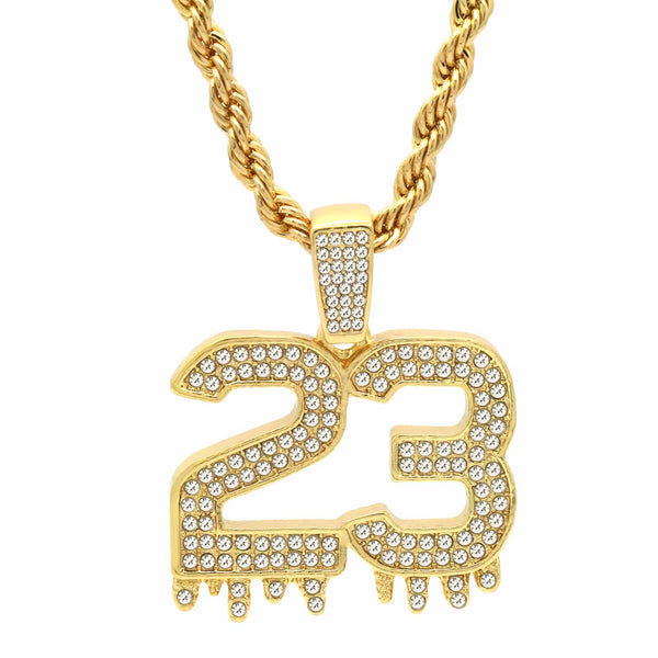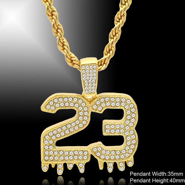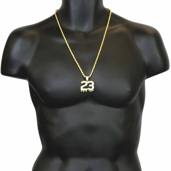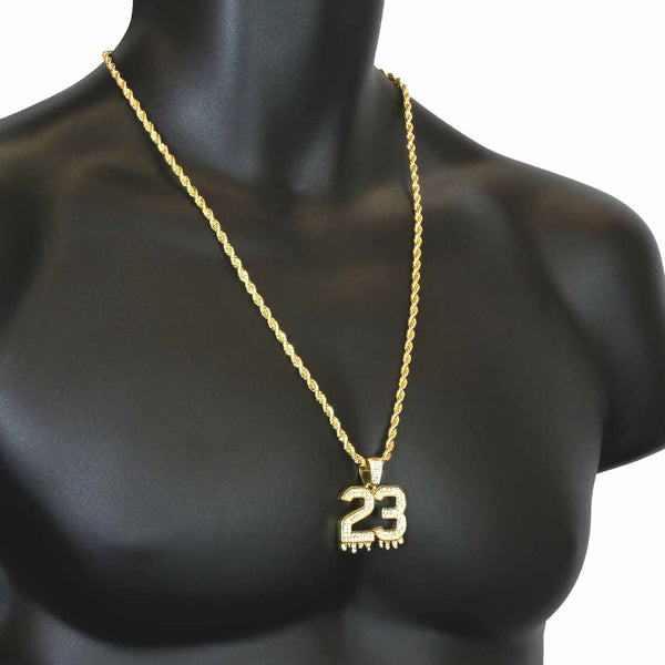 Hip Hop Bling 14K Gold Filled Necklace Pendant 14K Gold Filled Iced Out DripĀ 23 Hip Hop Pendant with 4mm 24" Rope Chain Gold Filled Over Brass Makes this Necklace Look...