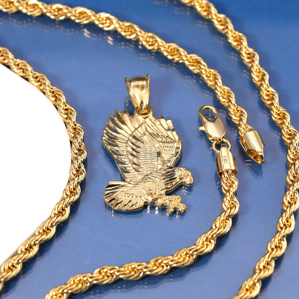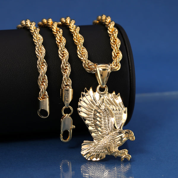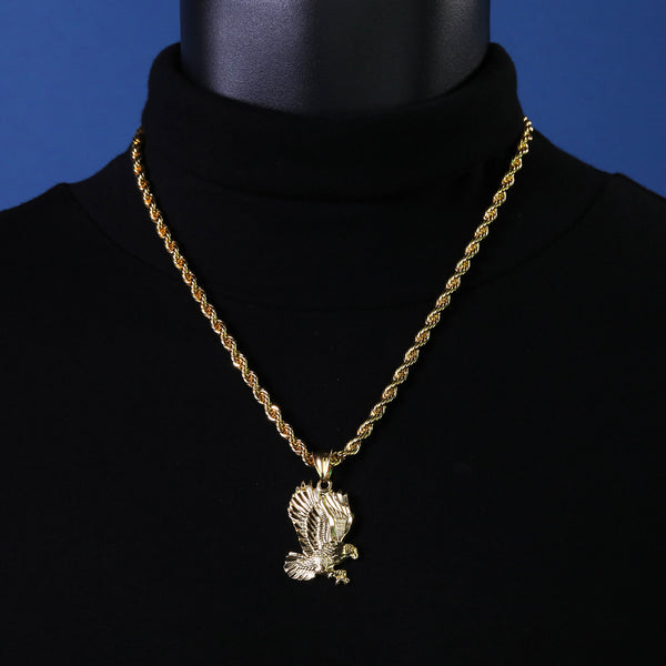 14K Gold FilledĀ EagleĀ Pendant Gold Filled Over Brass Makes this Necklace Look & Feel as a Real Gold Piece Elegant Pendant Diamond cut edges Color: Gold Chain - 5mm 20" Inches...