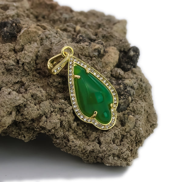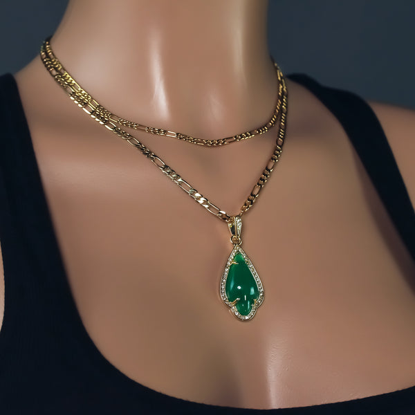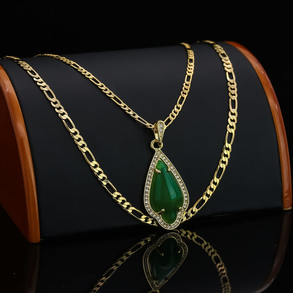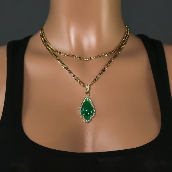 Exquisite Iced Green Jade Arrowl Shape 14k Gold PT Pendant 18"20" Figaro Chains