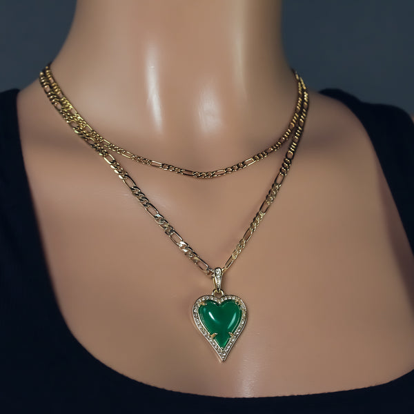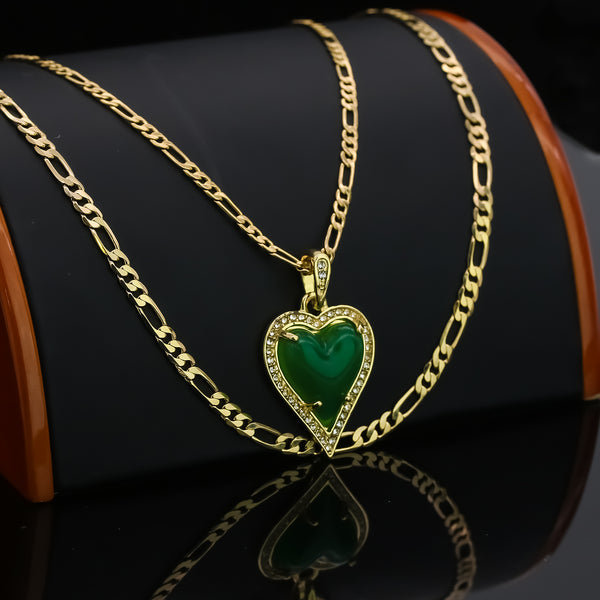 Exquisite Iced Green Jade Heart Shape 14k Gold PT Pendant 18"20" Figaro Chains