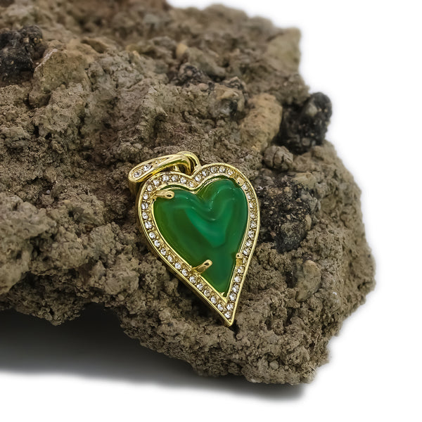 This is a Green Jade Heart Shape Pendant hanging from a Set Of 18"20" Figaro chain . Each and every stone on this pendant is prong set, same as real diamonds. The shine on...
