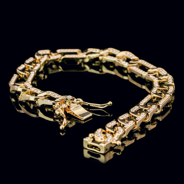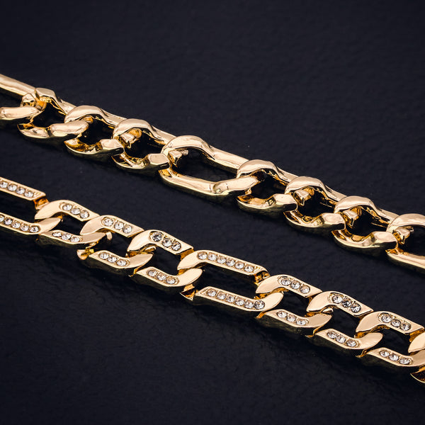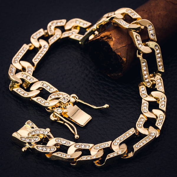 Figaro Bracelet Link Fully Iced 14k Gold Plated 9" Box Clasp