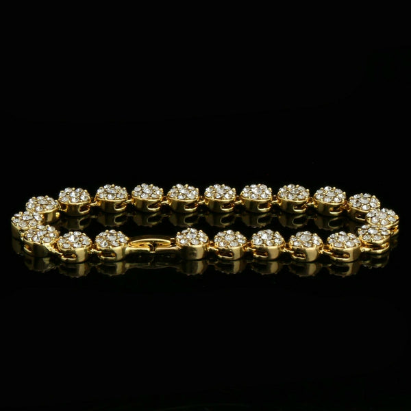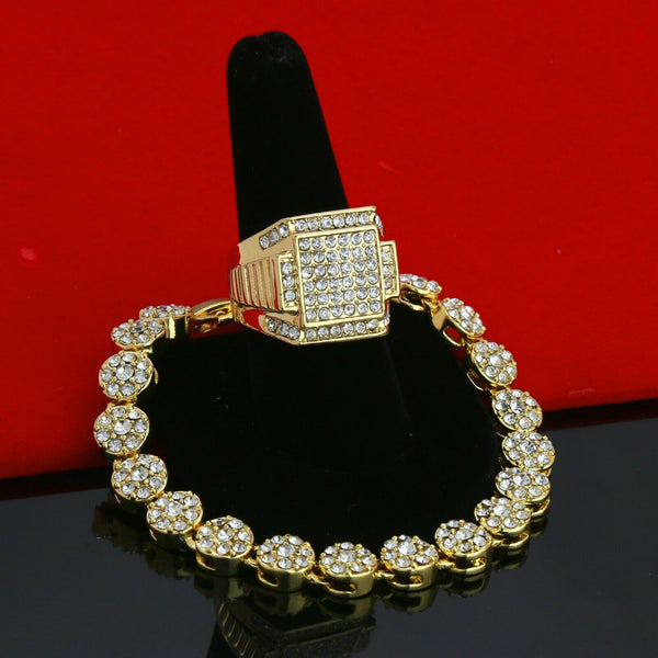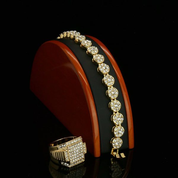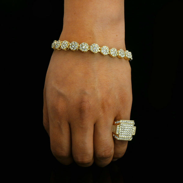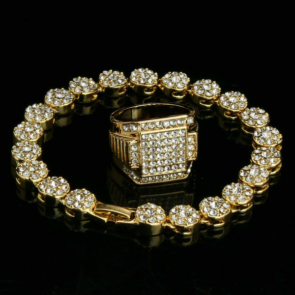 Round Flower Bracelet - Iced Out Ring Set Flower Bracelet Fully Cz / 14K Gold Filled Mens Ring Hip- Hop Style Available Size: Mens Womens 7,8, 9, 10, 11, 12...