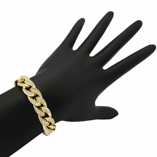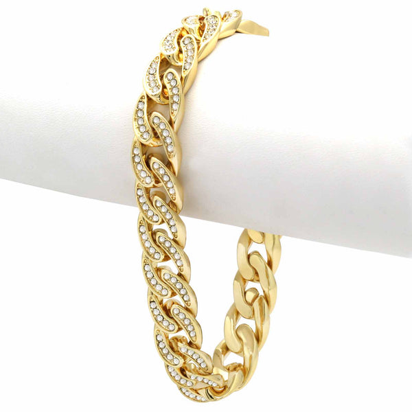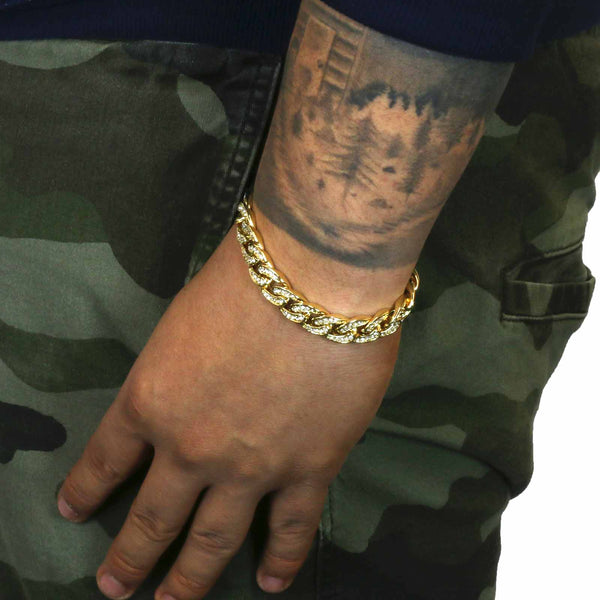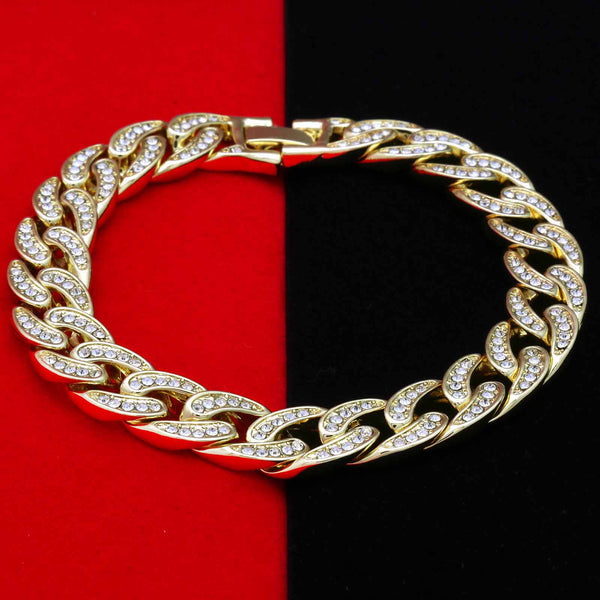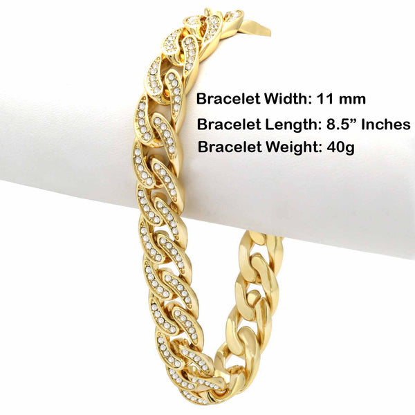 Elegant Fully ICED OUT Cuban Bracelet Makes You Shine Perfect. High-impact 14k Gold Plating over Brass Lustrous 14K Gold Finish in front of all links Large width of 11 mm/8.5"INCHES medium sized Bracelet Carefully interlocked...