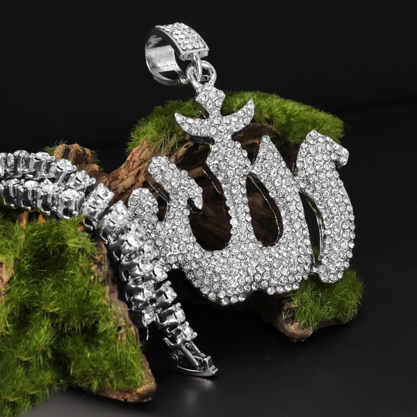 Fully Cubic-Zirconia ALLAH Pendant Silver Plated ICED Two Tennis 18", 20" Chain