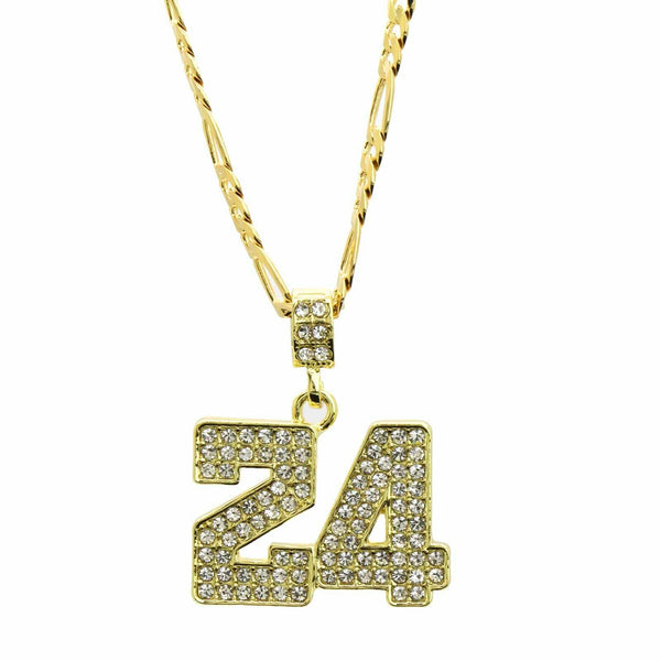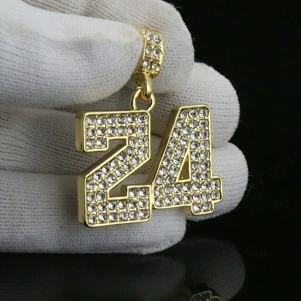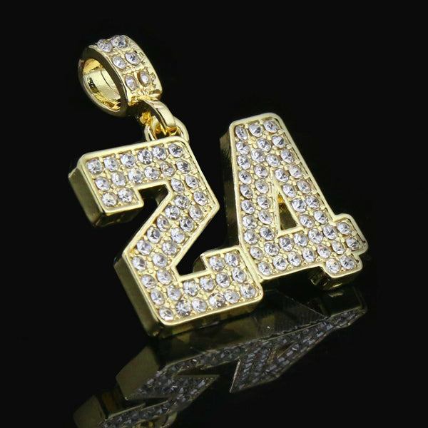 This is an Iced Out #24 basketball pendant hanging from a 24" Figaro chain . Each and every stone on this pendant is prong set, same as real diamonds. The shine on...